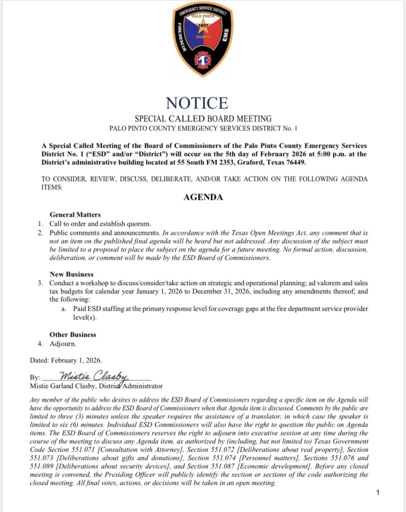 Agendas & Minutes, News & Announcements Special Called Board Meeting 2/5/26 Jan 31, 2026 | By Palo Pinto ESD #1 Screenshot